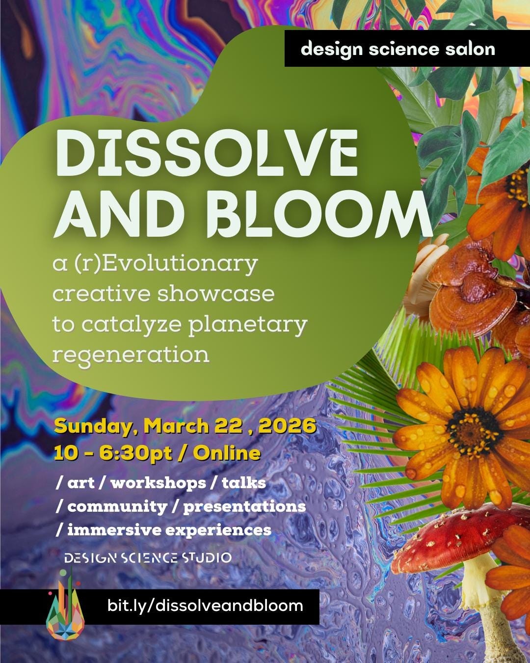 This upcoming Salon is called “Dissolve & Bloom,” where we collectively dissolve our cultures, worldviews, technologies, systems and indeed ourselves—into the base elements that may be nurtured into the blooming of our living systems’ futures. 🌻